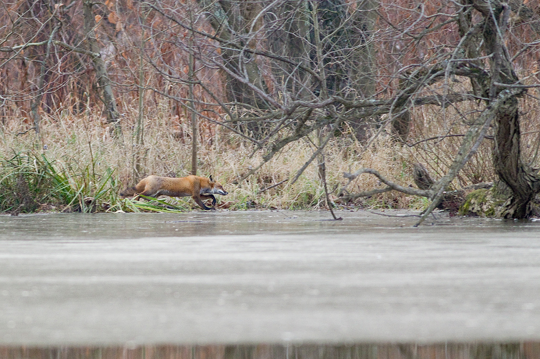 Here are two pics of a Fox I saw last weekend running along the shore of the ‘pond’ at the end of the NCR Trail …